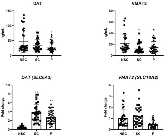 In our study, the VMAT2 gene expression level was significantly lower in the p group compared to healthy controls, while no significant difference was found between the SCs and NSCs.