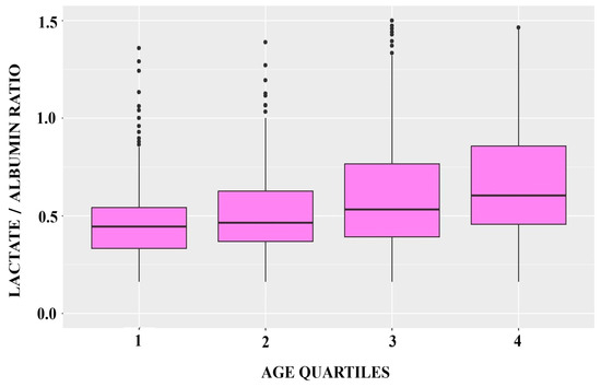 Boxplots of lactate/albumin ratio according to age quartiles.