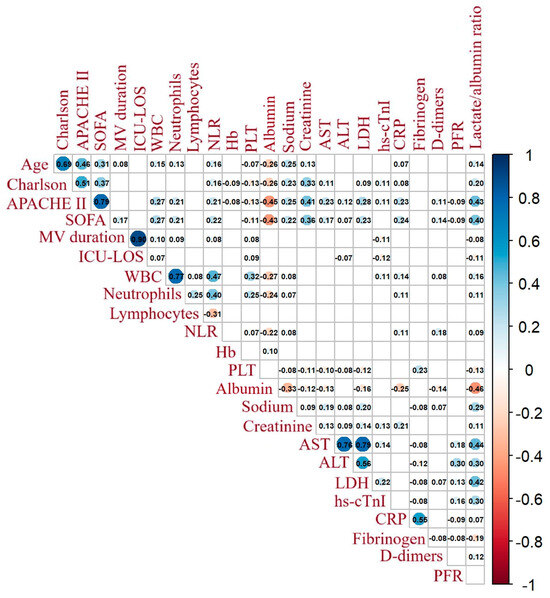 Correlation matrix of lactate/albumin ratio with other variables. Numbers inside squares represent Spearman’s rho correlation coefficients. Blank squares denote non-significant correlations, e.g., p > 0.05. Abbreviations: APACHE, acute physiology and chronic health evaluation; SOFA, sequential organ failure assessment; MV, mechanical ventilation; ICU–LOS, intensive care unit–length of stay; WBC, white blood cell; NLR, neutrophil to lymphocyte ratio; Hb, hemoglobin; PLT, platelets; AST, aspartate aminotransferase; ALT, alanine aminotransferase; LDH, lactate dehydrogenase; hs-cTnI, high-sensitivity cardiac troponin I; CRP, C-reactive protein; PFR, PaO2/FiO2 ratio.