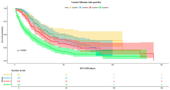 Kaplan–Meier survival curves according to the lactate/albumin ratio quartiles, with shaded ribbons indicating the corresponding 95% CI’s. Abbreviations: ICU-LOS, intensive care unit length of stay; CI, confidence interval.