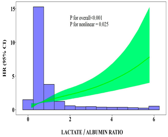 Restricted cubic spline regression analysis of lactate/albumin ratio with ICU mortality. The heavy central lines represent the estimated adjusted HR, with shaded ribbons indicating the corresponding 95% CI. The histogram illustrates the distribution of patients. There was a nonlinear association between lactate/albumin ratio and HR. The model was adjusted for age, sex, NLR, Hb, PLT count, sodium, creatinine, AST, ALT, LDH, hs-cTnI, CRP, fibrinogen, d-dimers, PFR, presence of shock, vaccination status, CRRT, remdesivir, dexamethasone, hypertension, diabetes mellitus, obesity, cardiovascular disease, chronic pulmonary disease, chronic kidney disease, and active malignancy. Abbreviations: ICU, intensive care unit; HR, hazard ratio; CI, confidence interval; NLR, neutrophil to lymphocyte ratio; Hb, hemoglobin; PLT, platelets; AST, aspartate aminotransferase; ALT, alanine aminotransferase; hs-cTnI, high-sensitivity cardiac troponin I; CRP, C-reactive protein; PFR, PaO2/FiO2 ratio; CRRT, continuous renal replacement therapy.