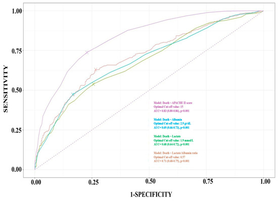 Figure 5 depicts the ROC curves of the APACHE II score, lactate/albumin ratio, lactate and albumin for ICU mortality prediction, with AUCs of 0.83 (95% CI: 0.80–0.86), 0.71 (0.68–0.75), 0.68 (0.64–0.72), and 0.69 (0.65–0.73), respectively. The DeLong test demonstrated that the AUC of lactate/albumin ratio was significantly higher than that of lactate (p < 0.001). An improvement in the APACHE II score’s (reference model) predictive ability for ICU outcome after the addition of the lactate/albumin ratio was evaluated using NRI and ΔAUC (ΔAUC = 0.0049, DeLong’s p = 0.0536, and NRI = 0.0063, CI: −0.1232–0.040). The non-significant ΔAUC, as well as the NRI’s CI crossing zero, indicate that there is no strong evidence to support the notion that the addition of the lactate/albumin ratio to the APACHE II score is better or worse in terms of reclassification improvement.