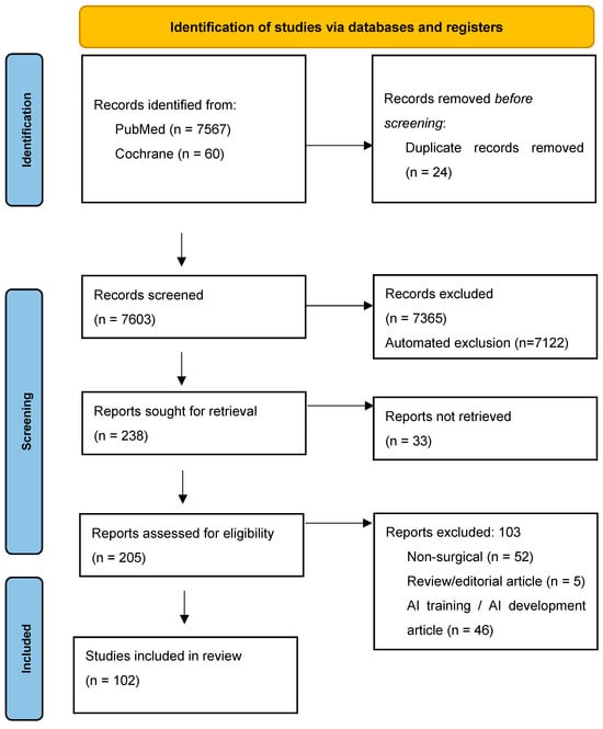 From the 205 studies that were retrieved and assessed for eligibility, a total of 103 studies were excluded. The excluded studies were rejected for the following reasons: 52 studies were excluded due to not being a surgical application of AI models in clinical settings [,,,,,,,,,,,,,,,,,,,,,,,,,,,,,,,,,,,,,,,,,,,,,,,,,,,], 46 studies were excluded due to being considered as AI development, preclinical, experimental, or training studies [,,,,,,,,,,,,,,,,,,,,,,,,,,,,,,,,,,,,,,,,,,,,,], and 5 were excluded due to being considered review or editorial articles [,,,,].