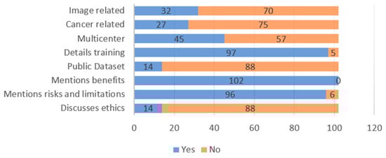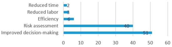 Authors described the benefits of use of their AI model as follows: 51 (50%) referred to improvements in the decision-making process, 40 (39%) referred to improvements in risk assessment, 6 (6%) referred to improved efficiency, and 3 (3%) referred to reduced labor, while 2 (2%) referred to reduced work time.