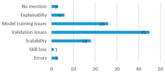 Authors addressed the risks and limitations of their AI model as follows: 45 (44%) mentioned validation issues, 26 (26%) mentioned model training issues, 18 (18%) mentioned scalability issues, 6 (6%) mentioned explainability issues, 3 (3%) mentioned possibility of errors in the model, and 1 (1%) referred to risk of loss of skill. In addition, three (3%) did not refer to any risks or limitations in their models.