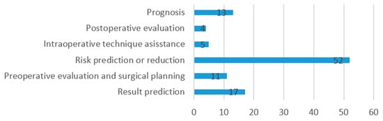 According to this study, current uses of AI models in surgery are predominantly in the pre-operative phase (62%), emphasizing the predictive capabilities of AI. This is further highlighted by the fact that 51% of studies employed AI models for risk prediction or reduction, and 16% used them for predicting results after surgery. The use of AI for predicting risk and complications is predominant in the literature, as reviewed by Bektas et al. []. AI and machine learning models have also shown advantages over conventional risk scores in cardiac surgery [].