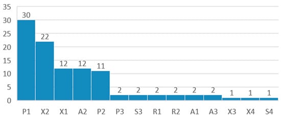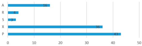Articles grouped according to SURVAS validation method. (A) Advanced methods. (R) Resampling methods. (S) Single-split methods. (X) Cross-validation methods. (P) Performance metrics.