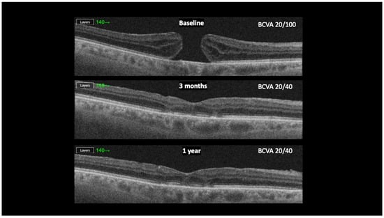 Six patients with FTMH and no other known ocular comorbidities were included in the study. Demographic and clinical characteristics are presented in Table 1. Four (66.6%) were female, and two were males (33.4%). Median age was 71 years (56–84). The mean duration of symptoms, including diminished visual acuity and metamorphopsia before surgery, was 10.5 months (3–24 months). The mean preoperative minimum hole diameter was 480 μm (337–602), and the mean basal hole size was 1208 μm (703–1748). The preoperative BCVA was 0.7 logMAR in five and 0.3 logMAR in one patient. Postoperatively, the BCVA improved in 5 (83.3%) patients and remained the same in 1 (16.7%). The average postoperative BCVA was 0.42 LogMAR, ranging from 0.60 to 0.0. The patient with the best preoperative BCVA (0.3 LogMAR) exhibited the best postoperative BCVA (0.0 LogMAR). The FTMH has closed in all 6 cases (100%) (Figure 2). At the follow-up examination three months after the surgery, we observed complete closure of the FMMH, with the restoration of retinal layers that remained stable during the 1-year follow-up period (Figure 3). We did not find any intra- or postoperative complications in any of these cases.