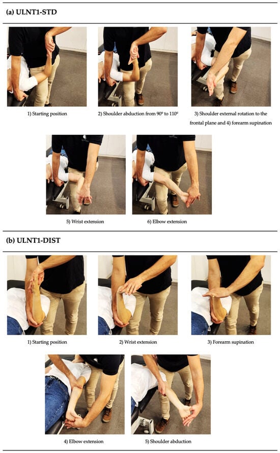 Joint movements and their respective order for (a) ULNT1-STD and (b) ULNT1-DIST. The tests were performed until symptom onset. Note that in both sequences, the scapula was stabilized in a neutral position to prevent elevation during the tests. ULNT1-STD = standard sequence of the upper limb neurodynamic test 1. ULNT1-DIST = distal-to-proximal sequence of the upper limb neurodynamic test 1.