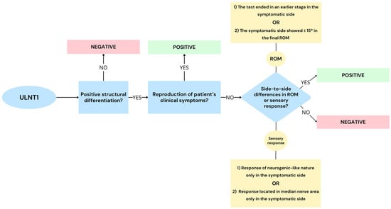 Decisional tree to determine a positive ULNT1 for carpal tunnel syndrome following criterion 4. ULNT1 = upper limb neurodynamic test 1. ROM = range of motion.
