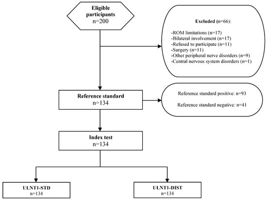 Therefore, this study aims to investigate the diagnostic accuracy of ULNT1 using the standard sequence (ULNT1-STD) [18] and a distal-to-proximal sequence (ULNT1-DIST) for detecting CTS in a sample with unilateral symptoms. Using a local-initiated sequence could facilitate symptom reproduction in CTS, and comparing the affected side to the unaffected side may improve the detection of altered median nerve mechanosensitivity when the test does not directly reproduce the patient’s symptoms.