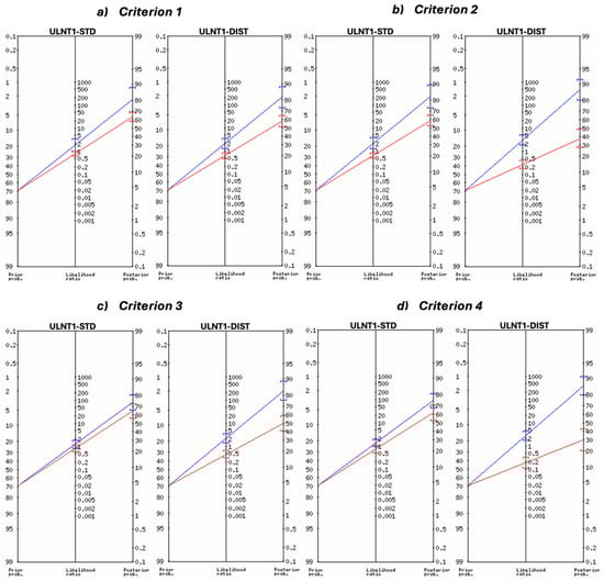 Fagan’s nomogram to graphically show the change from the pre-test probability (69%) using ULNT1-STD and ULNT1-DIST with (a) criterion 1—symptom reproduction; (b) criterion 2—symptom reproduction OR ROM asymmetry; (c) criterion 3—symptom reproduction OR response asymmetry; (d) criterion 4—symptom reproduction OR ROM OR response asymmetry. Positive SD in the affected limb was required in all criteria. Blue lines indicate the positive likelihood ratio with the corresponding post-test probability. Red lines indicate the negative likelihood ratio with the corresponding post-test probability.