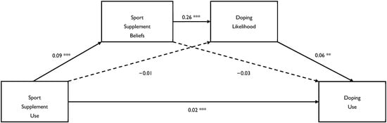 The effects of sport supplement use on doping use, and the mediating roles of sport supplement beliefs and doping likelihood. Note. The values presented are the unstandardized regression coefficients. A solid line represents a significant relationship. ** p < 0.01, *** p < 0.001.