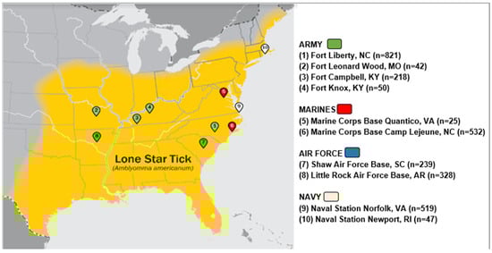 Using banked sera from the Department of Defense Serum Repository (DoDSR), this longitudinal serological study (a repeated cross-sectional analysis) was performed assessing IgE levels to alpha-gal in US active-duty military personnel. The DoDSR collects excess serum from military members completing periodic and mandatory HIV screening and is the largest bank of human serum in the world [19,20]. Study participants were included if they were active-duty service members in the U.S. Army, Air Force, Navy, or Marine Corps whose first assignment following the completion of basic training was at one of ten military installations. The installations for sampling were selected based on the reported range of A. americanum at the time of serum draw and comprise the following sites: Fort Liberty, North Carolina; Fort Leonard Wood, Missouri; Fort Campbell, Kentucky; Fort Knox, Kentucky; Marine Corps Base Quantico, Virginia; Marine Corps Base Camp Lejeune, North Carolina; Shaw Air Force Base, South Carolina; Little Rock Air Force Base, Arkansas; Naval Station Norfolk, Virginia; and Naval Station Newport, Rhode Island (Figure 1) [21,22].