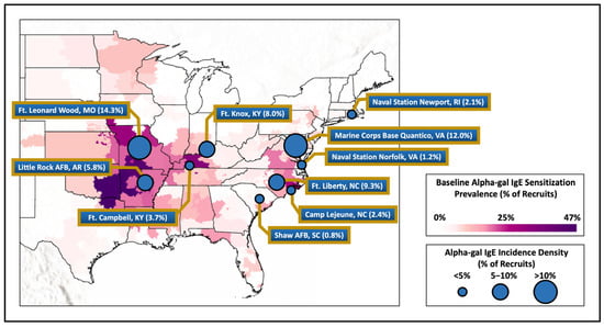 Baseline alpha-gal IgE sensitization of military members compared to measured incidence density of recruits from various installations around the United States. Legend. Map showing alpha-gal IgE sensitization at baseline laboratory testing for military recruits based on member’s home zip code of record at accession compared with the incidence density of alpha-gal IgE at the select military installations demonstrated by the circle size.