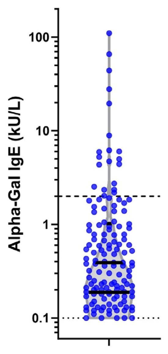 Alpha-gal IgE levels at second time point in 138 seropositive individuals. Legend: Violin plot on log scale of alpha-gal IgE levels among the 138 positive subjects at the second serum sample. Dark solid lines represent interquartiles of the data. The light dashed lines mark the diagnostic cut-off of the assay (0.1kU/L) and a level of 2 kU/L which has a stronger correlation with clinically symptomatic mammalian meat allergy.