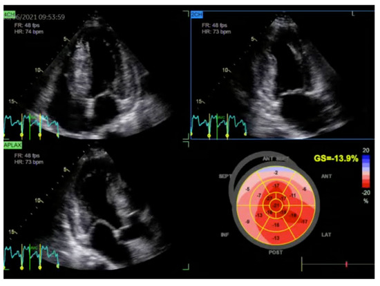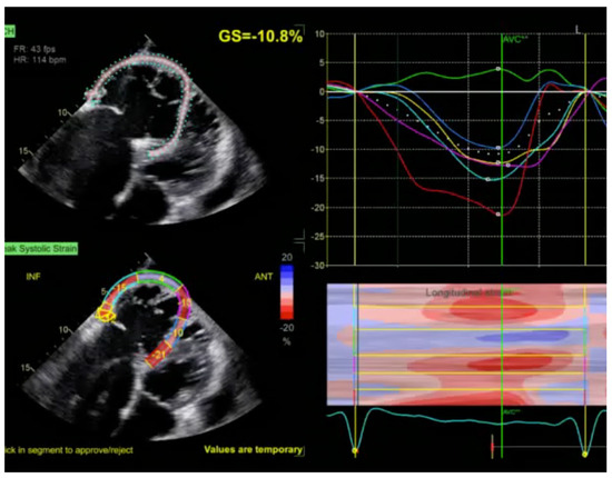 One of the most critical features of HCM is the detection of asymmetric left ventricular hypertrophy (LVH), which is often localized to the baseline part of interventricular septum. A peak LV outflow tract (LVOT) gradient ≥30 mmHg defines obstructive HCM (Figure 1). TTE enables dynamic assessments of this gradient, particularly during Valsalva maneuvers or exercise, which helps reveal latent obstruction that may not be apparent at rest. Exercise stress echocardiography is recommended for symptomatic patients with LVOTO <50 mmHg at rest or during bedside maneuvers [7]. Moreover, advanced echocardiographic techniques, such as speckle tracking strain imaging, provide insights into myocardial mechanics, revealing subclinical myocardial dysfunction even in patients with preserved ejection fraction (Figure 2) [7,8,9].