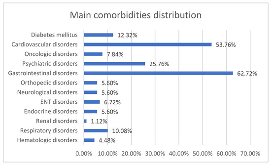 The patients included in the study also presented comorbidities such as other gastrointestinal disorders (67.72%), cardiovascular disorders (53.76%), and psychiatric disorders (25.76%) (Figure 2).