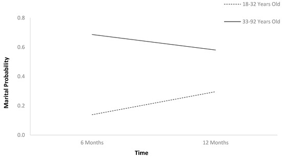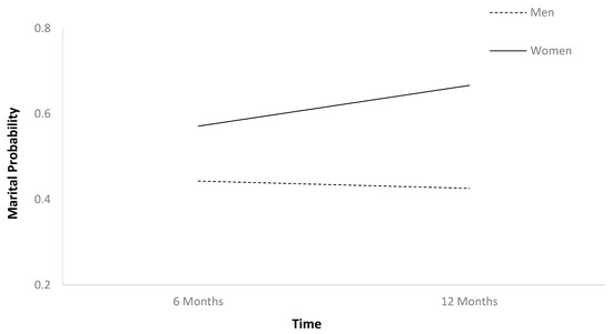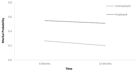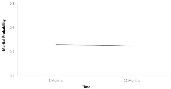 The first HLM (Table 2) found that marital probability remained stable between 6 and 12 months after TBI (Figure 1). In Table 2, b-weights are the parameter estimates of the predictor’s statistical effect on relationship status trajectories over time. The respective p-values reflect whether these parameter estimates are statistically significant (if less than 0.05), or in other words, whether these baseline variables statistically predict the probability of relationship status holistically across the two time points. Individuals who were employed at baseline had higher marital probability trajectories than those who were unemployed (Figure 2). Older individuals had higher marital probability trajectories than younger individuals (Figure 3), and women had higher marital probability trajectories than men (Figure 4).