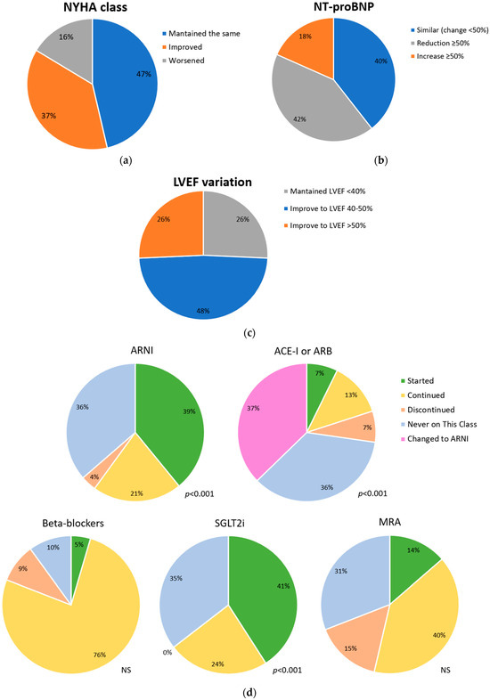 Variation in NYHA class (a), NT-proBNP levels (b), LVEF (c) and medical therapies (d) from first to last visit at the Heart Failure Clinic. ACE-I—angiotensin-converting enzyme inhibitor; ARB—angiotensin-receptor blocker; ARNI—angiotensin receptor-neprilysin inhibitor; LVEF—left ventricle ejection fraction; MRA—mineralocorticoid receptor antagonist; NYHA—New York Heart Association; NS—non-significant; SGLT2i—sodium-glucose co-transporter 2 inhibitor.