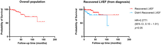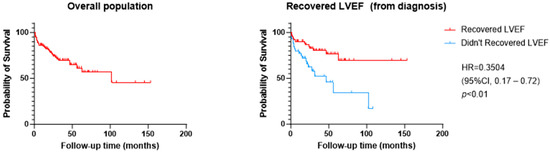 Kaplan–Meier curves for all-cause mortality, presented for the overall population and according to LVEF recovery. LVEF recovery was defined as LVEF increase of at least 10% from LVEF at diagnosis to a value over 50%.