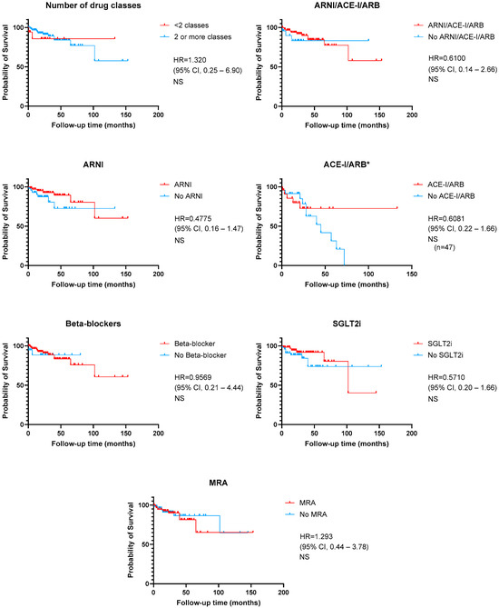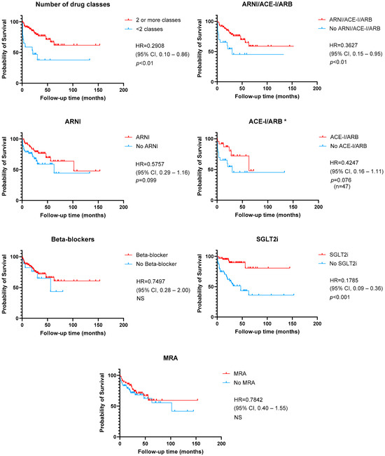 Concerning overall mortality, survival analysis showed a benefit for patients who recovered LVEF (HR = 0.2771 [95% CI 0.10–1.01], p < 0.05) but no differences when analyzing each drug class (Figure 4 and Figure 5).