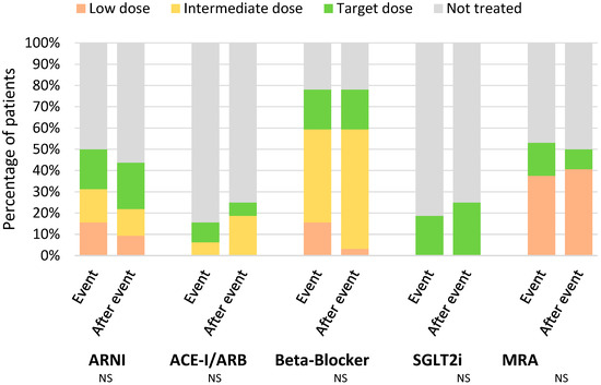 Changes in GDMT dosage after the first episode of worsening HF. ACE-I—angiotensin-converting enzyme inhibitor; ARB—angiotensin-receptor blocker; ARNI—angiotensin receptor-neprilysin inhibitor; LVEF—left ventricle ejection fraction; MRA—mineralocorticoid receptor antagonist; NS—non-significant; SGLT2i—sodium-glucose co-transporter 2 inhibitor.