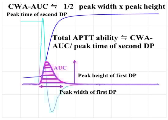 The area under the curve of the CWA (AUC-CWA) of the first DP indicates the ability of coagulation velocity instead of the peak time or height (Figure 1), and “half of the peak height × peak width” may be similar to AUC-CWA. In addition, “AUC-CWA/second peak time” may show the total coagulation ability, as shown by the APTT. The reference interval was within the 95% confidence interval of the healthy volunteers.