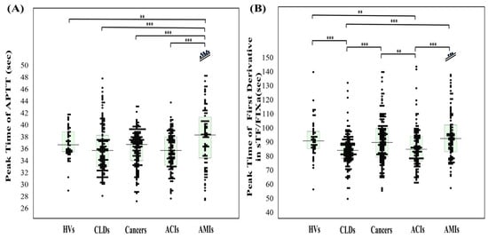 Peak times of APTT (A) and sTF/FIXa (B) in HVs, and patients with CLD, cancer, ACI, and AMI. APTT, activated partial thromboplastin time; sTF/FIXa, small amount of tissue factor-induced FIX activation assay; HVs, healthy volunteers; CLD, chronic liver disease; ACI, acute cerebral infarction; AMI, acute myocardial infarction; **, p < 0.01; ***, p < 0.001. Navy line, fibrin formation curve; FF, fibrin formation; pink line, first derivative curve (velocity); first DPH, first derivative peak height; light blue, second derivative curve (acceleration); second DPH, second derivative peak height; solid line, patient; dotted line, control.