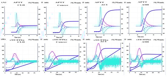 CWA-APTT (A) and CWA-sTF/FIXa (B) in patients with CLD, cancer, ACI, and AMI. Navy line, fibrin formation curve; FF, fibrin formation; pink line, first-derivative curve (velocity); first DPH, first derivative peak height; light blue, second derivative curve (acceleration); second DPH, second-derivative peak height; solid line, patient; dotted line, control.