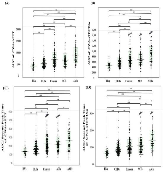 The reference interval of the AUC/second DPT of CWA-APTT and CWA-sTF/FIXa was 70.8–231 mabs and 37.2–118 mabs, respectively. The AUC/second DPT of CWA-APTT was significantly higher in the patients with cancer {212 mabs (165–278 mabs)}, AMI {265 mabs (186–342 mabs)}, and ACI {212 mabs (156–258 mabs)} than in the HVs {135 mabs (105–163 mabs)} and CLDs {165 mabs (133–210 mabs)}, and it was significantly higher in the patients with AMIs than in the HVs, the patients with cancers, and the patients with CLD (Figure 4C). The AUC/second DPT of CWA-sTF/FIXa was significantly higher in the patients with AMI {128 mabs (103–176 mabs)} than in the HVs {64.4 mabs (57.0–75.9 mabs)} and the patients with ACI {107 mabs (80.9–133 mabs)}, cancer {95.2 mabs (77.0–128 mabs)}, and CLD {86.3 mabs (72.0–100 mabs)}, and it was significantly higher in the patients with ACI than in the HVs and the patients with CLD (Figure 4D). Regarding the AUC value from the ROC analyses of the CWA-AUC/second DPT for ACI or AMI vs. non-thrombosis, the CWA-APTT showed that it was >0.800 in patients with AMI or ACI vs. HVs, and the CWA-sTF/FIXa showed that it was >0.900 in patients with AMI or ACI vs. HVs (Table 3B).