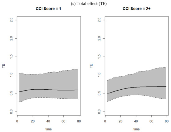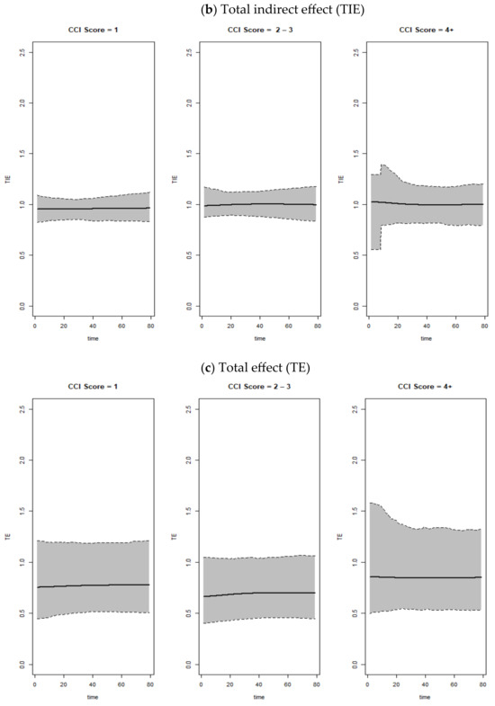 Pure direct effect (PDE), total indirect effect (TIE), and total effect (TE) over time related to the length of hospitalization for the elderly population (65+ years), stratified by Charlson Comorbidity Index.