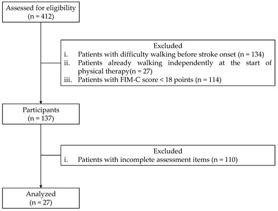 This study included 412 patients with or without osteoarthritis in the lower limbs who were hospitalized and rehabilitated for at least 3 months for unilateral supratentorial lesion stroke at the Tesseikai Neurosurgical Hospital between October 2020 and July 2024. Patients with difficulty walking pre-stroke onset, those who could walk independently at the start of physical therapy, those with a total Functional Independence Measure Cognitive Component (FIM-C) score of <18 points [17], and those with incomplete assessment items were excluded. Additionally, patients with an FIM-C score of <18 were excluded based on a previous study [17], where patients with stroke were categorized into the following three groups according to the degree of assistance they received while walking: unable-to-walk, moderate- or light-assistance, and monitored or fully independent groups. The mean FIM-C score for each group was determined, with the moderate- or light-assistance group having an FIM-C score of 18 ± 4.7 [17]. Overall, the final analysis included 27 patients (Figure 1). There were no losses to follow-up in this study. All patients who met the inclusion criteria and were not excluded based on the predefined exclusion criteria were included in the final analysis. This study was reported according to the Strengthening the Reporting of Observational Studies in Epidemiology guidelines.