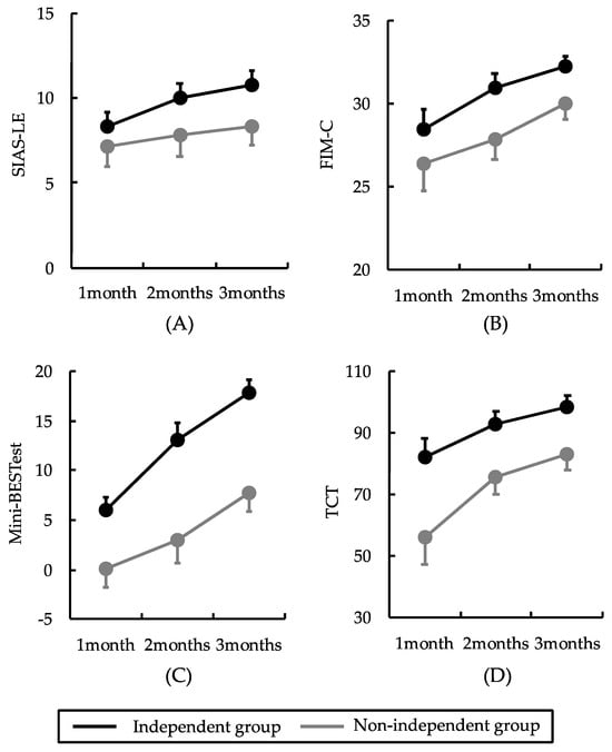 A two-way ANOVA revealed no significant interactions between timing and group factors for any of the clinical assessments (p > 0.05). However, the SIAS-LE, TCT, Mini-BESTest, and FIM-C demonstrated significant main effects on timing (p < 0.05). Post-test analyses indicated that the SIAS-LE, TCT, Mini-BESTest, and FIM-C scores were significantly higher at 2 and 3 months than at 1 and 2 months, respectively (p < 0.05). The TCT and Mini-BESTest scores differed significantly between the groups (p < 0.05) but not the SIAS-LE and FIM-C scores (p > 0.05). Post-test analyses revealed that the TCT and Mini-BESTest scores were significantly higher in the independent group than in the non-independent group (p < 0.05) (Table 2 and Figure 2).