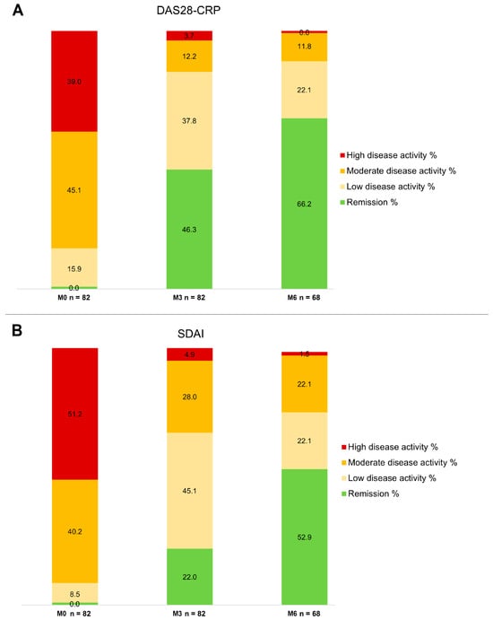 - Smolen, J.S.; Breedveld, F.C.; Schiff, M.H.; Kalden, J.R.; Emery, P.; Eberl, G.; van Riel, P.L.; Tugwell, P. A simplified disease activity index for rheumatoid arthritis for use in clinical practice. Rheumatology 2003, 42, 244–257. [Google Scholar] [CrossRef]