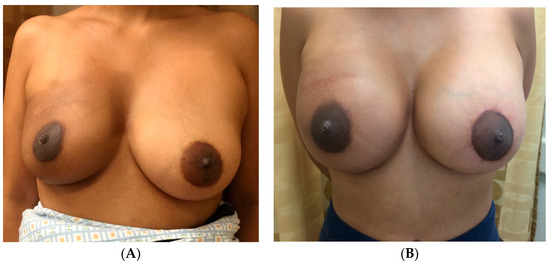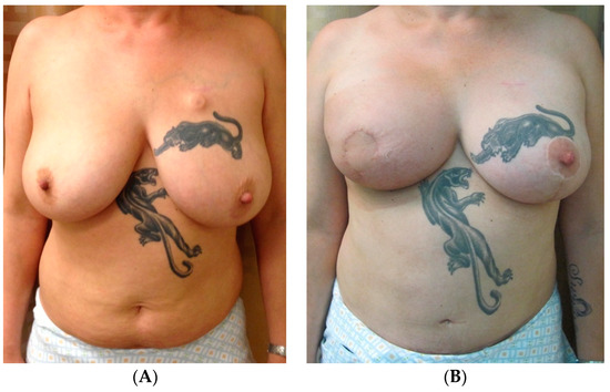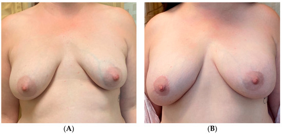 An additional, versatile tool for addressing asymmetry in almost any type of breast reconstruction, including cases of unilateral autologous reconstruction, is fat grafting. For instance, autologous fat may be used to improve the volume in patients who desire a larger reconstructed side to match the native breast, or vice versa. This may be particularly useful for thin patients undergoing autologous reconstruction, who may otherwise consider prosthetic devices for volume augmentation [45,49,50]. Figure 5 highlights a 49-year-old female who underwent left-nipple-sparing mastectomy with immediate abdominal-based autologous reconstruction and a right vertical mastopexy for symmetry. To achieve symmetry of volume and shape, she also underwent autologous fat grafting with 240 mL to the right and 120 mL to the left breast, with the postoperative result shown in Figure 5B.