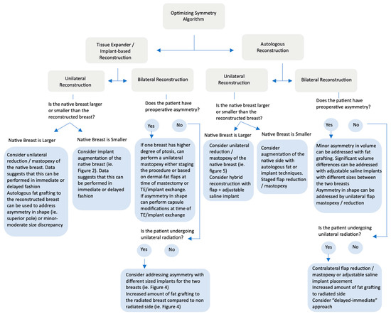 Various tools have been described to address postoperative asymmetry, including modifications to both the reconstructed or native breast, such as augmentation mammaplasty, reduction, mastopexy of the native breast, mastopexy of autologous flaps, and hybrid autologous/implant reconstruction. As a result, selecting which tool to use based on patient examination, reconstructive goals, and the reconstructive method requires experienced decision-making. This article, therefore, provides a review of the current literature, highlights case examples, and provides a treatment algorithm for obtaining symmetry.