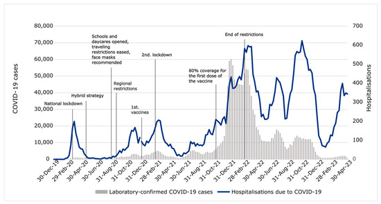 Figure 1 illustrates the course of the COVID-19 pandemic in Finland. Five major hospitalization waves can be distinguished, which somewhat aligns with laboratory-confirmed positive tests. At the onset of the pandemic, social restriction measures were announced at the national level, and restrictions were subsequently made more regionally. Regional restrictions of varying severity were lifted by February 2022. Appendix A contains a more detailed description of the restrictions and vaccinations in Finland during the pandemic [16,17,18,19,20,21].