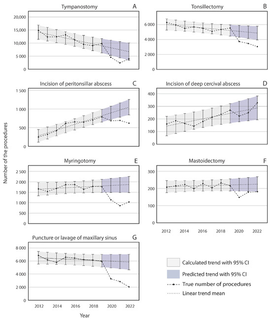 The trends in the volume of infection-related procedures in Finland between 2012 and 2022 are illustrated in Figure 2. Before the COVID-19 pandemic, the annual surgical volumes of tympanostomies (Figure 2A) and tonsillectomies (Figure 2B) declined, whereas the volumes of peritonsillar abscess incisions (Figure 2C) and incisions of deep cervical abscesses (Figure 2D) demonstrated increasing trends. The annual volumes of myringotomies, mastoidectomies, and punctures/lavages of maxillary sinuses remained rather stable between 2012 and 2019 (Figure 2E–G).