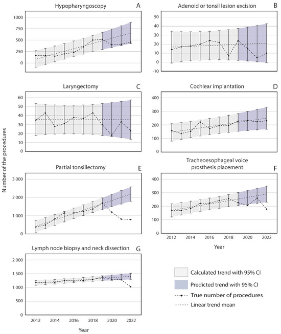 During the pandemic years, no significant change was observed compared with the pre-pandemic trend in the number of hypopharyngoscopies, adenoid or tonsil lesion excisions, laryngectomies, or cochlear implantations (Figure 3A–D). Partial tonsillectomies and, to a lesser degree, placements of tracheoesophageal voice prostheses and cervical lymph node biopsies diverged from the predicted trend during the pandemic years (Figure 3E–G). A lesser, non-significant decrease was observed in every noninfectious procedure during the pandemic, except cochlear implantations, which stayed on an increasing trend throughout the pandemic (Figure 3). Cervical lymph node excision volumes were stable in 2020 and 2021, but in 2022, a 27% reduction was observed. The partial tonsillectomy procedure volume decreased by 34.7% in 2020, by 59.6% in 2021, and by 63.7% in 2022 (Figure 3E). Compared with the predicted trend, the prevalence of placements of tracheoesophageal voice prostheses was barely significantly lower (21.1%) during 2020 but rose back to the prediction in 2021, with a decrease in 2022 to 38.1% of the predicted trend (Figure 3F).