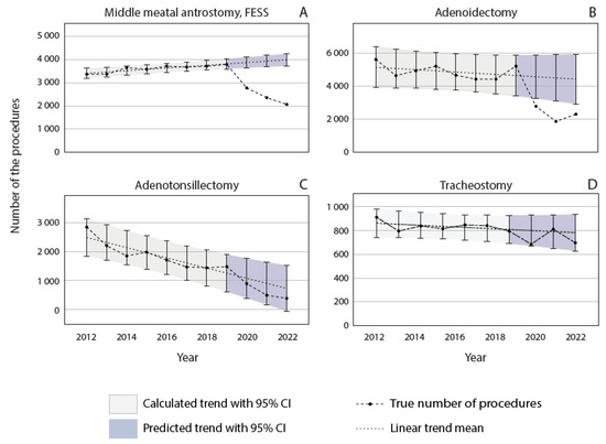 Figure 4 illustrates the trends of uncategorized procedures in Finland from 2012 to 2022. Adenoidectomies, adenotonsillectomies, maxillary antrostomies, and tracheostomies were labeled uncategorized since their indications could not be exclusively categorized as either infection-related or nonrelated. Before the COVID-19 pandemic, the number of MMAs increased (Figure 4A), whereas adenotonsillectomies demonstrated a decreasing trend (Figure 4B). Adenoidectomies and tracheostomies were rather stable (Figure 4C,D). Compared with the predicted trend, significantly fewer endoscopic maxillary antrostomies were performed during the pandemic, with reduced volumes of 28.3% in 2020, 40.0% in 2021, and 48.2% in 2022 (Figure 4A). A similar trend was observed for adenoidectomies, with rates of 39.2%, 59.0%, and 48.0% from 2020 to 2022, respectively (Figure 4C). Adenotonsillectomies and tracheostomy procedure volumes were associated with the predicted trend during the pandemic (Figure 4B–D).