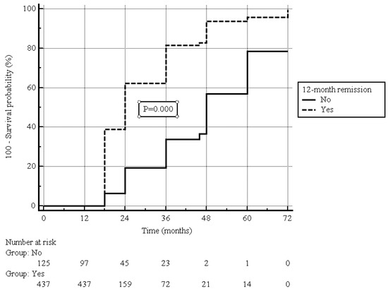 Estimated cumulative clinical remission probability during follow-up in patients with or without clinical remission at 12-month follow-up; log-rank test.