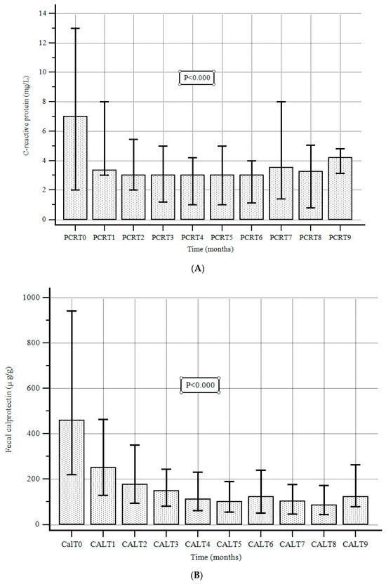 (A). C-reactive protein values at baseline and during follow-up. Data are expressed as the median and interquartile range (error bars), according to the Friedman test. (B). Fecal calprotectin values at baseline and during follow-up. Data are expressed as the median and interquartile range (error bars), according to the Friedman test.