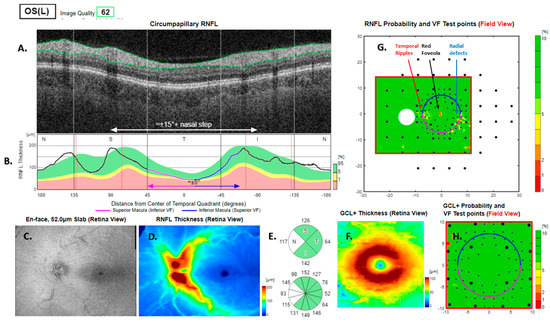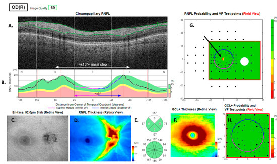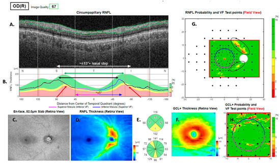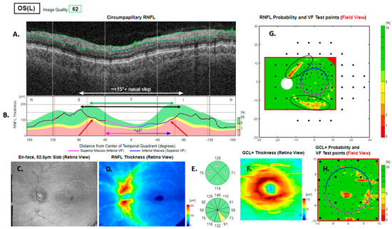 - Ghadiali, Q.B.; Hood, D.C.; Lee, C.B.; Manns, J.; Llinas, A.; Grover, L.K.B.; Greenstein, V.C.; Liebmann, J.M.; Odel, J.G.; Ritch, R. An analysis of normal variations in retinal nerve fiber layer thickness profiles measured with optical coherence tomography. Eur. J. Gastroenterol. Hepatol. 2008, 17, 333–340. [Google Scholar] [CrossRef]