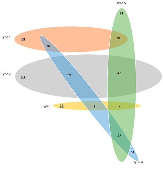 Combination diagram showing the degree of per-eye overlap between the RNFL-based visual field-projected tissue defect alerts. A total of 119 combinations were found. Types 1, 2 and 3 had 0 combinations. Types 4 and 5 had combinations with all the other groups. Type 5 and 2 were frequently combined, accounting for 60% of the type 5 combinations. The underlined numbers represent the total numbers of eyes per group.