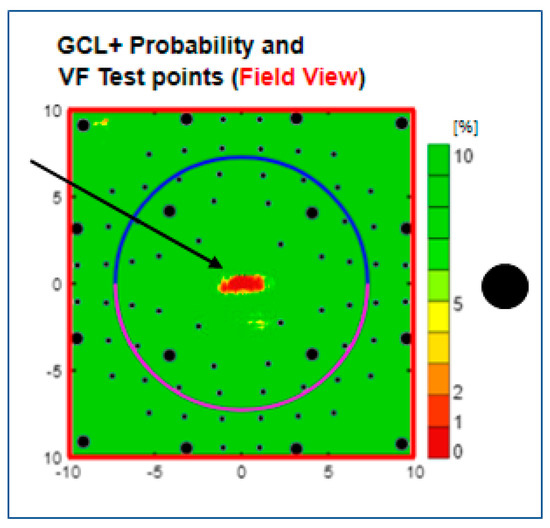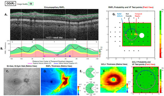 The Type (5) Radial defects, seen in 144 eyes (23%), typically spans the edge of the macular visual field at a distance of 8 ± 4 degrees from the centre of the visual field (Figure 8). Their location and direction suggest that they may be related to the periodicity of the peripapillary nerve fibre layer thickness curve associated with the intercalation of the RNFL with the peripapillary vessel segments. This phenomenon is hypothetically influenced by the method used to interpolate RNFL thickness, where the layer is interspersed with large vessels. This artefact is most prominent within 8 degrees of the centre of the visual field. Of the 144 eyes, 71 (49% of the eyes in the group and 12% of all the eyes) showed predominantly radial defects, whereas 73 (51% of the eyes in the group and 12% of the total eyes) also displayed other prominent RNFL-based alerts (Figure 8).