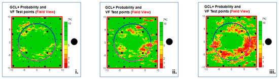 Type 6 GC-IPL-related thickness deficit alerts in three healthy right eyes. Perifoveal patterns of annular clutter are seen in all three eyes with increasing density from left to right, from rough outline (i), over half-circle (ii) to full circle (iii). The black dots to the right of the scale indicate the physiological blind spots. GC-IPL, ganglion cell–inner plexiform layer. VF, visual field. GCL+ above = GC-IPL.