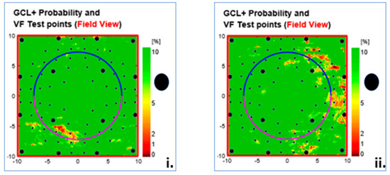 Type 9 GC-IPL-related thickness deficit alerts from two healthy right eyes showing different degrees of irregularly located alerts in indistinct patterns, from mild (i) to severe (ii). The black dots indicate the location of the physiological blind spot. GC-IPL, ganglion cell–inner plexiform layer. VF, visual field. GCL+ above = GC-IPL.