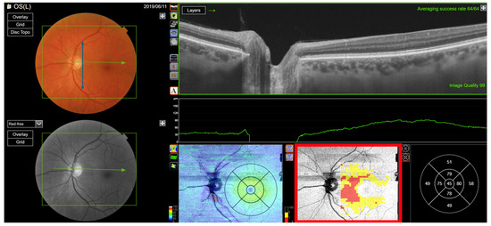 - Qiu, K.; Chen, B.; Yang, J.; Zheng, C.; Chen, H.; Zhang, M.; Jansonius, N.M. Effect of optic disc–fovea distance on the normative classifications of macular inner retinal layers as assessed with OCT in healthy subjects. Br. J. Ophthalmol. 2019, 103, 821–825. [Google Scholar] [CrossRef]