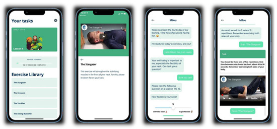 Patients were required to perform the exercises daily and received notifications and guidance from a chatbot. For each exercise, a video with spoken instructions was included in the app, as well as an overview of the number of series and repetitions for each exercise. The application was available for both iOS and Android operating systems. Screenshots from the application can be seen in Figure 2.